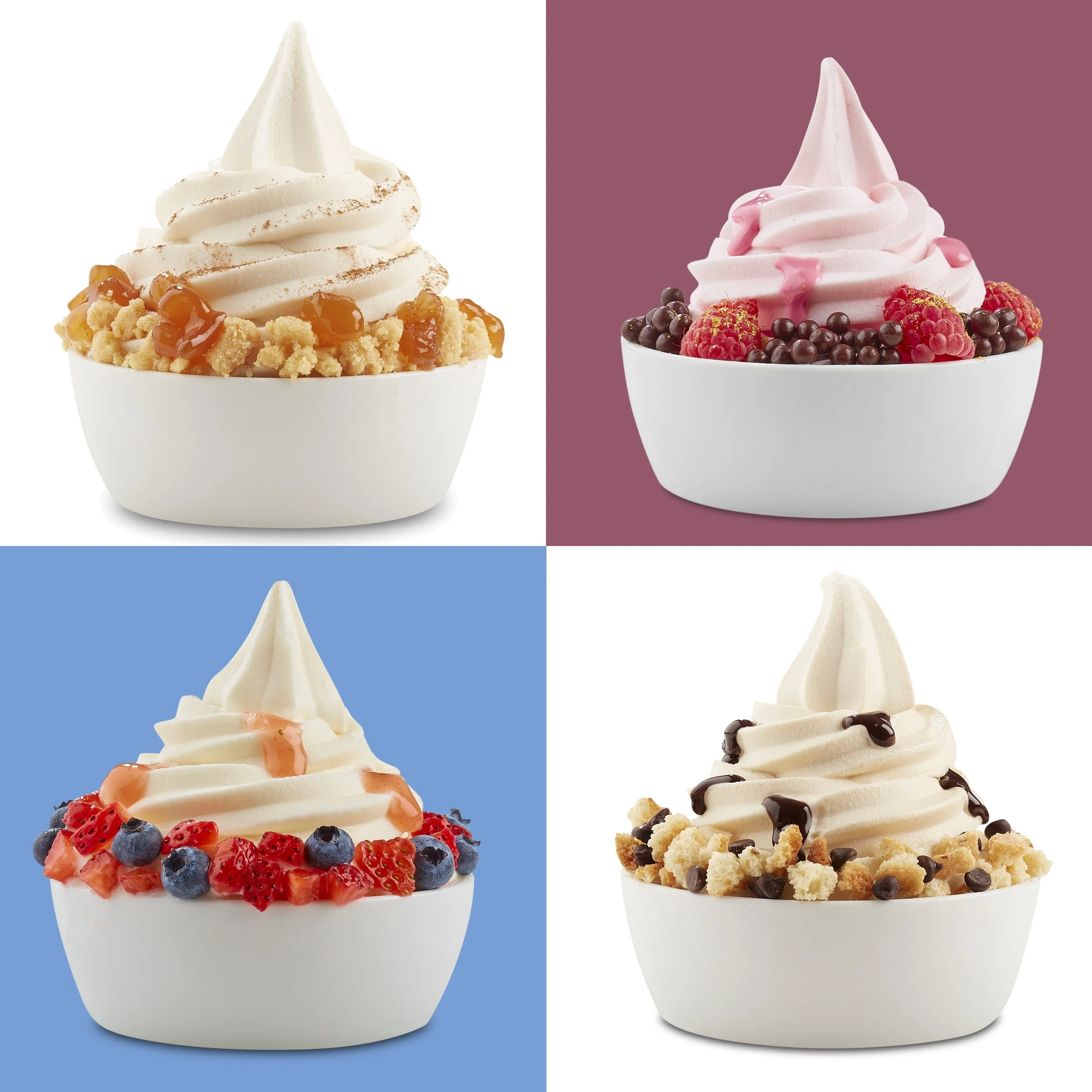 Indulgent frozen yogurt cups topped with fresh fruit, crunchy granola, and decadent syrups. Styled for a playful yet refined presentation by Phoenix food stylist Jess Suworoff. View fullsize